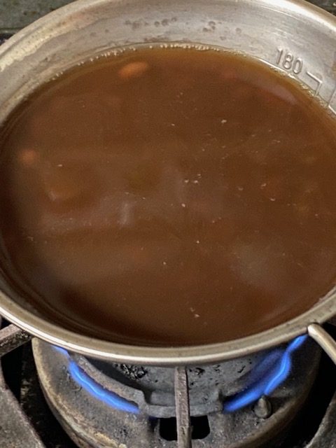 コッヘルだと水がすぐに蒸発するなぁ。まあ適当に水を足しながらやりましょう。