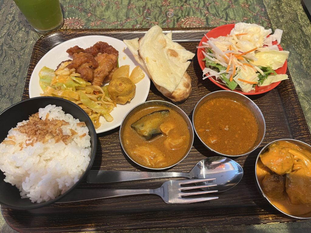 ここはバイキングになってて、カレーは5種類、サラダ、揚げ物、みそ汁、そしてラッシーも飲み放題!