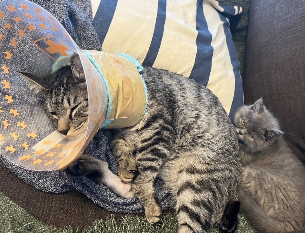 そしてうちにきた怪獣ちゃんは骨折にゃんたろーに寄り添うふりをして脚に噛みついたり、