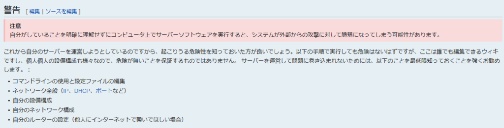 Minecraft Wikiのサーバのセットアップページにも書かれていますが、PCの設定ファイルやコマンド、ネットワークについてある程度の知識はあるべきです。