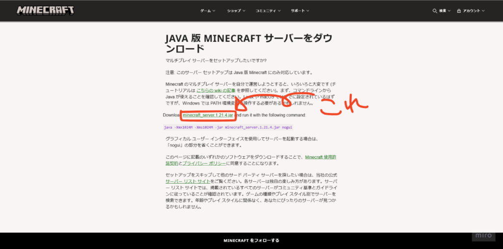 まず、こちらから「minecraft_server.バージョン.jar」をクリックしてサーバプログラムを入手してください。
