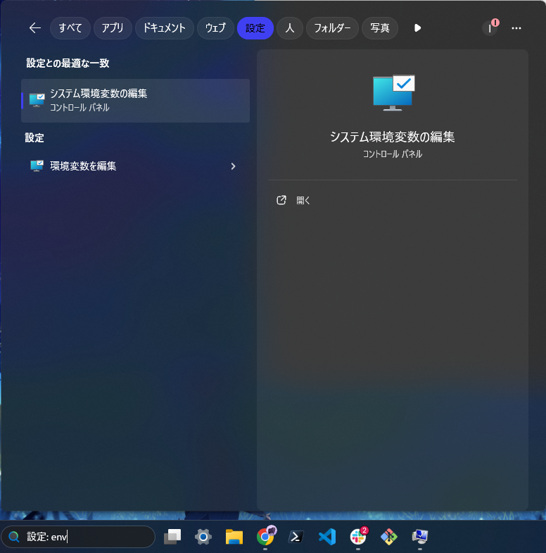 検索バーに「env」と入力し、「システム環境変数の編集」をクリックしてください。