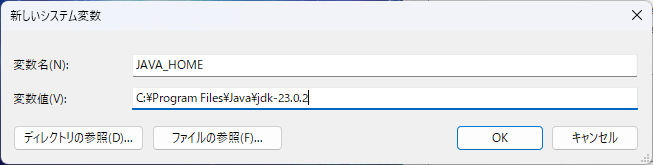 変数名に「JAVA_HOME」、変数値に先ほど配置したjdkのフルパス(今回の場合なら「C:\Program Files\Java\jdk-23.0.2」)を入力し、「OK」をクリックしてください。