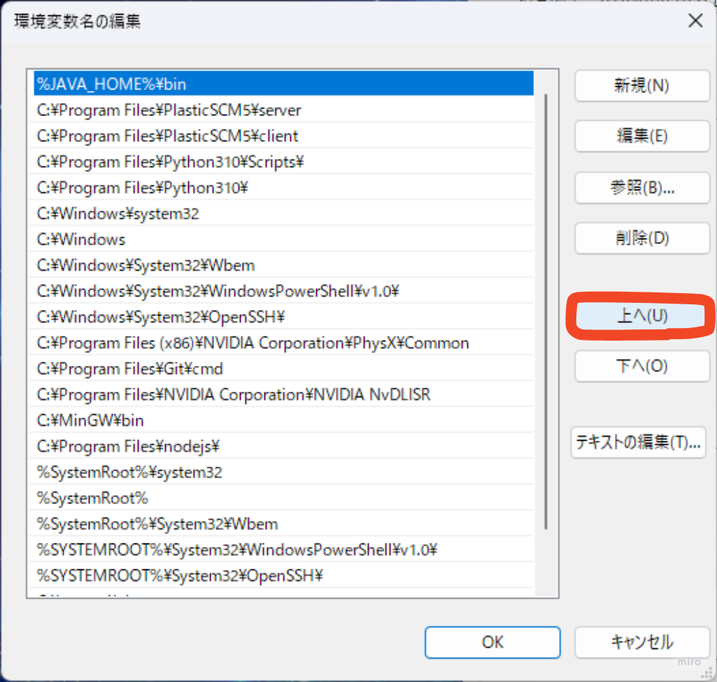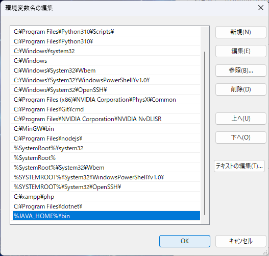 PATHはプログラムのbinまでのフルパスを設定すればよい(今回の場合ならC:\Program Files\Java\jdk-23.0.2\bin)のですが、せっかくJAVA_HOMEを設定したので「%JAVA_HOME%\bin」を設定します