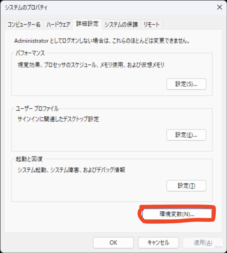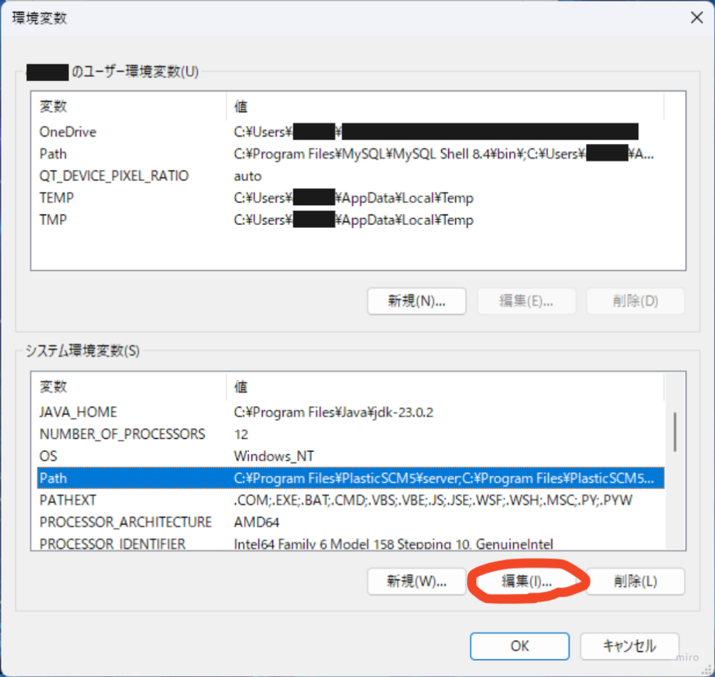 再度「env」→「システム環境変数の編集」→「環境変数」で環境変数の設定画面を開いてください。