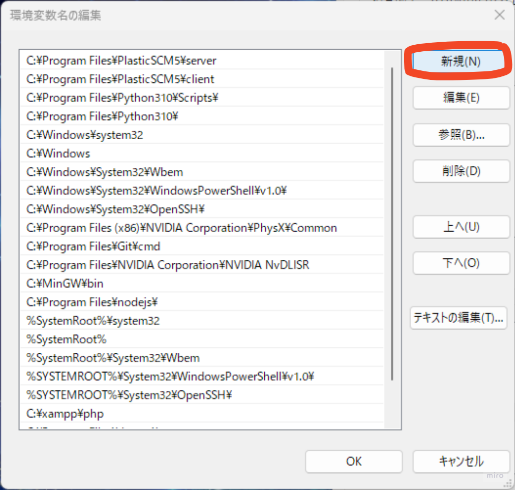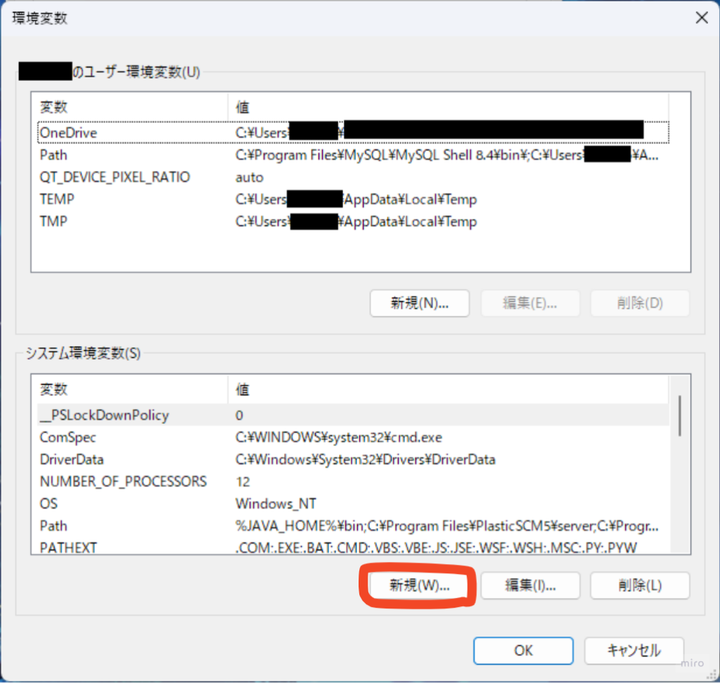 ユーザ環境変数とシステム環境変数がありますが、システム環境変数の方の「新規(W)…」をクリックしてください。