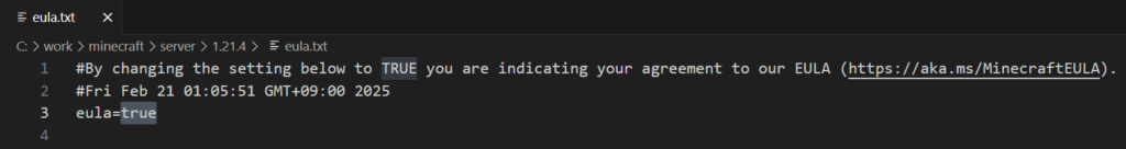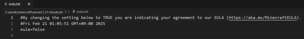 この中にある「eula.txt」というファイルをテキストエディタで開き、「eula=false」を「eula=true」に変更して保存してください。