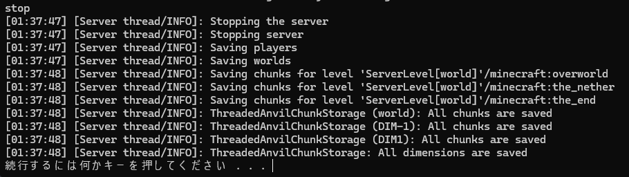 サーバが停止しました。コマンドプロンプトおよびMinecraftを終了して大丈夫です。
