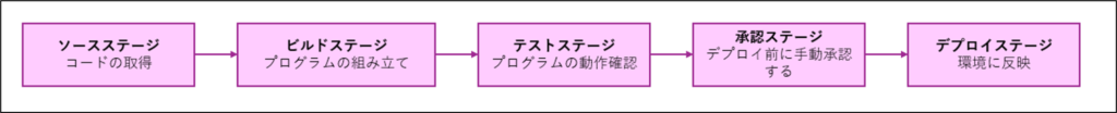 CodePipelineではこれらを「ステージ」としてつなげて、コードに変更があるたびに自動で流れるように設定できます。