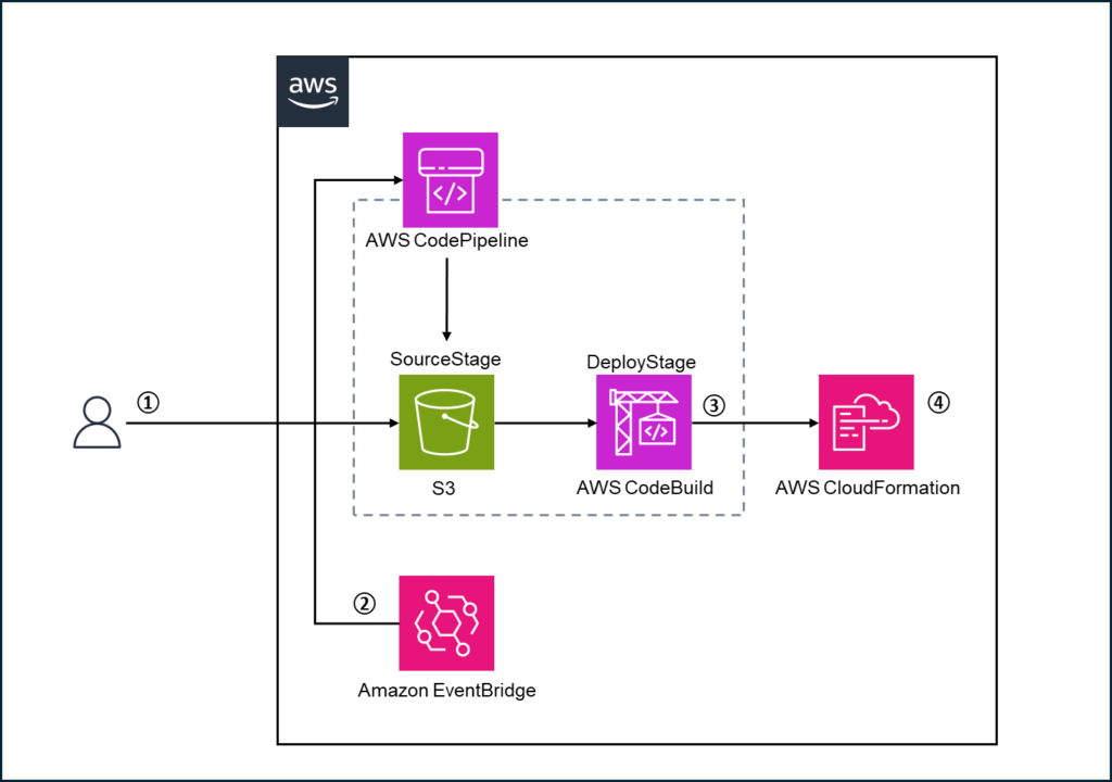 ②EventBridgeが、S3バケットにオブジェクト(CloudFormationテンプレート)が配置されたことを検知し、CodePipelineを起動させる。