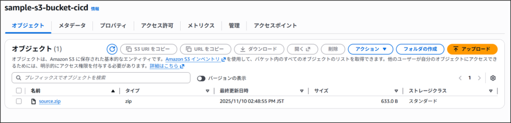 ではこれらを「source.zip」に固め、CodePipelineのソースステージに指定しているS3バケットへ配置します。