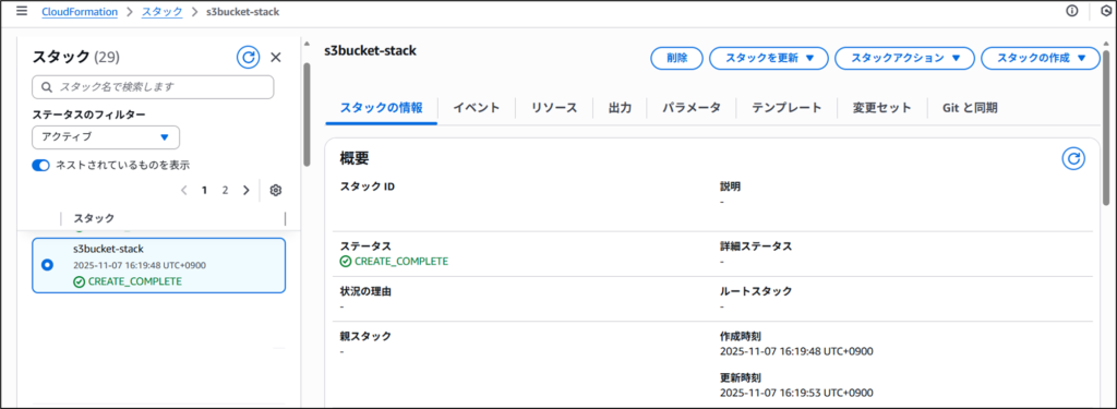 CloudFormationのコンソールを見に行くと、CLoudFormationのスタックが作られていることが確認できます。